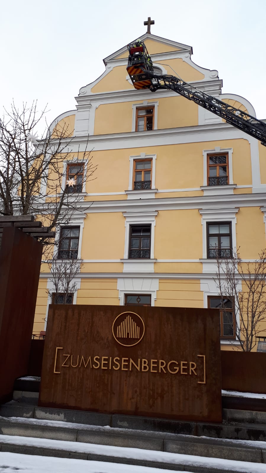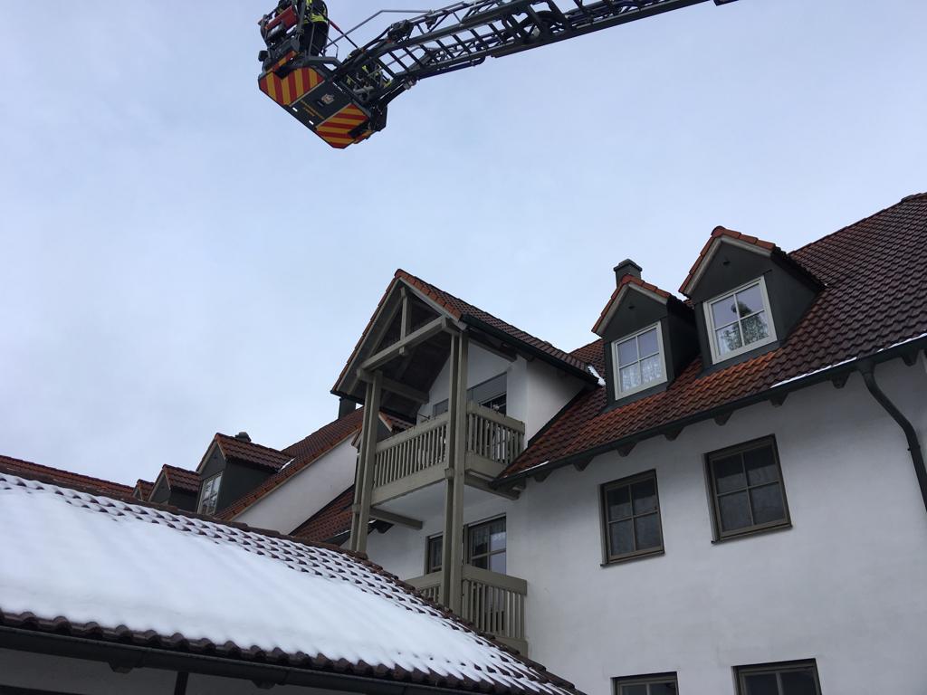 Der erste Ausbildungsort war die Asylunterkunft in Geisenhausen. Hier wurde das Anleitern an der Gebäudefront geübt. Das Befahren der Drehleiteraufstellfläche stellte hier schon die erste kleine Problematik dar, da Schnee und Eis ein Befahren der Fläche erschwerte. Nachdem das Fahrzeug positioniert war, wurde die Gebäudefront mit dem Korb abgefahren und zu sehen wie weit kommt die Drehleiter im Fall einer Personenrettung. Erstes Fazit war das Gebäude von dieser Position nicht komplett abgedeckt werden kann und ggf. von der Straße aus gewisse teile des Gebäude angefahren werden müssen. Eine weitere Übung konnte leider nicht durchgeführt werden, da die Gebäudeseite durch einen Abrollbehälter für Sperrmüll verstellt war.