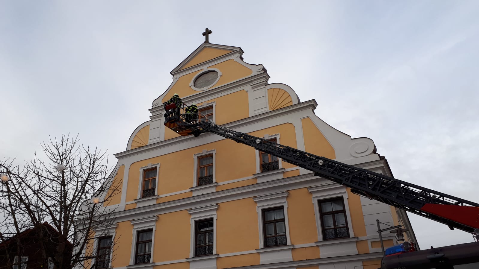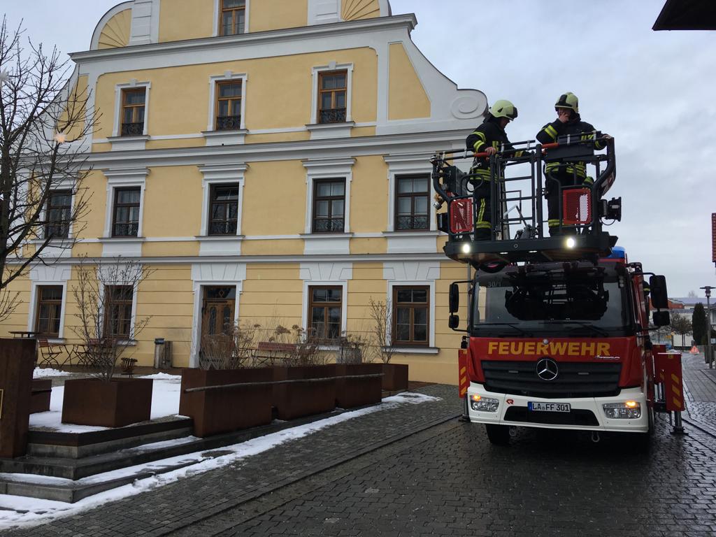 Das dritte Ziel war das Ärztehaus und der ehemalige Salzstadel. Beim Ärztehaus wurde die Aufgabe gestellt, die zum Parkplatz gerichteten Dachgauben mit dem Korb zu erreichen, was hier keine Problematik darstellte, da der Parkplatz nur minimal belegt war und kein fließender verkehr herrschte. Unter die Woche würde hier erhöhter Personalaufwand nötig sein, um die Zufahrten zu sperren. Dann ging es weiter zum Salzstadel. Hier wäre eine Rettung von Personen über die parkplatzseitigen Fenster nicht möglich, da diese reine Festverglasungen sind. Daher wäre eine Personenrettung über die Gebäudefront wo der Biergarten ist die einzige Möglichkeit. Die Drehleiter wurde in der Lorenzer Straße positioniert und der Arbeitsbereich war stark eingeschränkt durch den Salzstadel und das gegenüberliegende Gebäude. Das Anleitern an sich war hier einfach, der Platzbedarf stellte sich hier als das größere Risiko raus.Nach dem weiteren Maschinistenwechsel war das angegebene Ausbildungsobjekt das alte Rathaus am Marktplatz. Hier war es die Aufgabe den Zwiebelturm zu erreichen. Diese Aufgabe war an sich einfach, aber Kanaldeckel, ein Unterflurhydrant und parkende Fahrzeuge begrenzten die Auswahl der Fahrzeugaufstellung. Die Besatzung entschied sich auf Aufstellung auf komplette Fahrbahnbreite, so dass eine Absperrung errichtet und der Verkehr gelenkt werden musste. Um alle Drehleitermaschinisten mit der Bedienung zu vertrauen, wurde als letztes Objekt das Pfarrheim vorgegeben. Hier musste im ersten Stock eine Personenrettung durchgeführt werden. Das Ziel konnte hier leider nicht erreicht werden, da ein Baum verhinderte den Korb ans Fenster zu schwenken. Eine andere Art der Fahrzeugaufstellung konnte nicht erfolgen, da ein parkendes Fahrzeug die Fläche blockierte und neben dem Fahrzeug die Reichweite der Drehleiter nicht ausreichte aufgrund des großen Gartens.