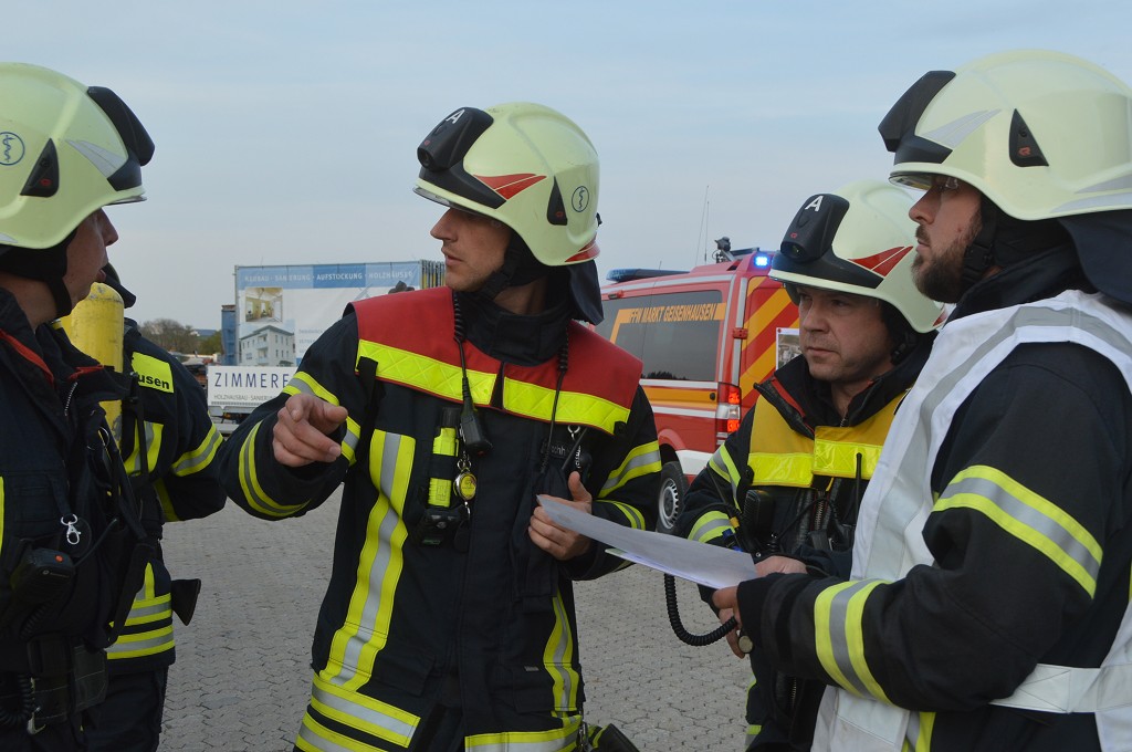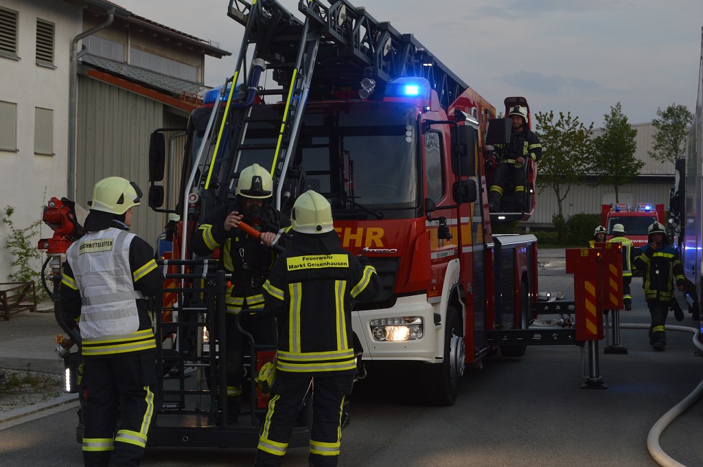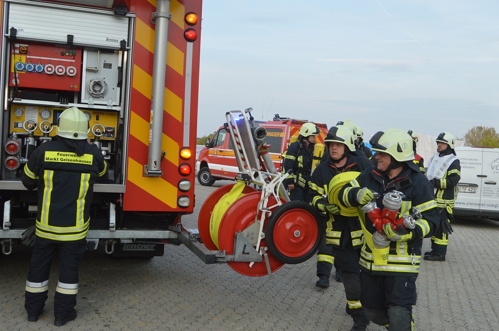 In einer Gemeinschaftsübung rückten die Freiwillige Feuerwehr Geisenhausen und ihre Ortsteil-Wehren von Bergham, Diemannskirchen, Holzhausen und Salksdorf am Freitagabend aus. Gemeldet war ein Vollbrand in den Hallen des Zimmereibetriebs Vögl in der Benzstraße.